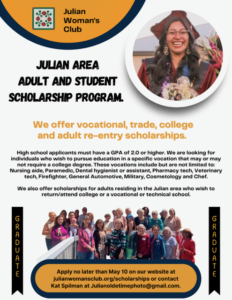 We also offer scholarships for adults residing in the Julian area who wish to return/attend college or a vocational or technical school.